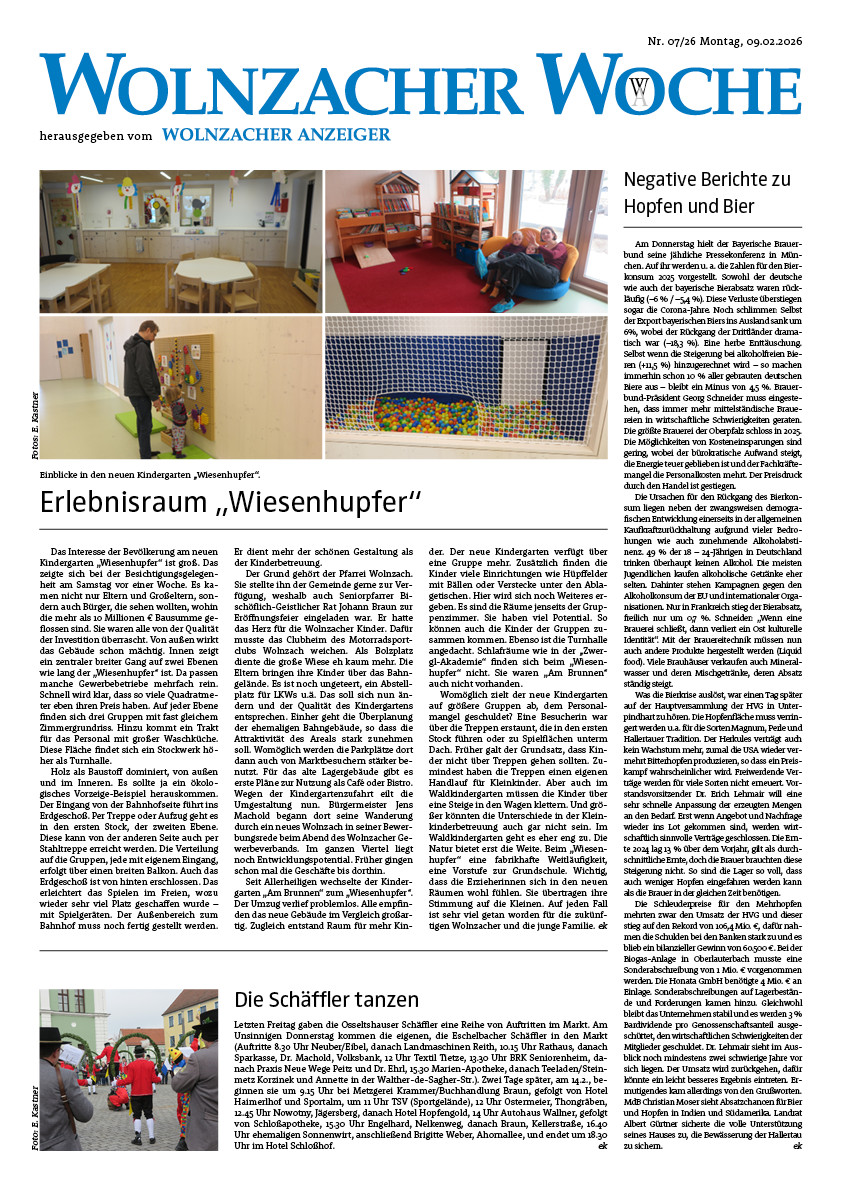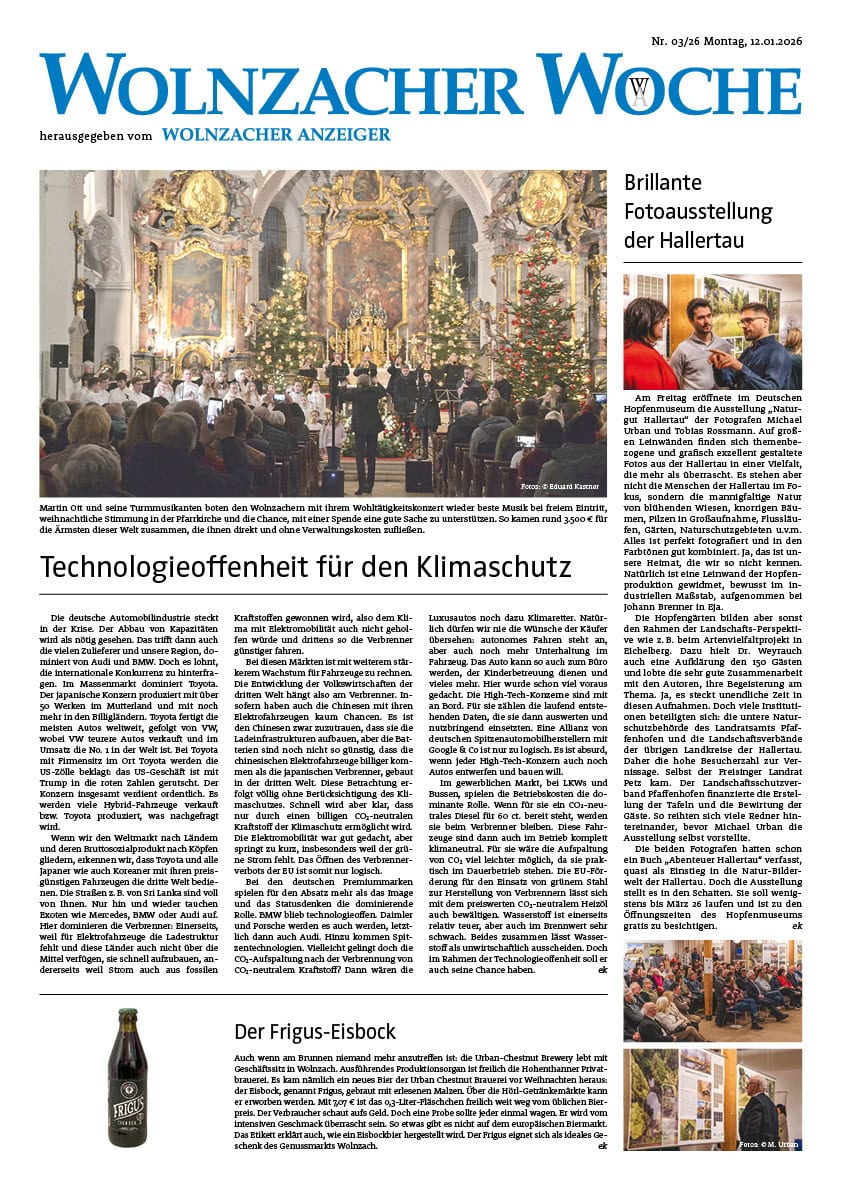 Jede Woche finden Sie hier Nachrichten, News und Hintergründe zu Wirtschaft, Klima, Politik und Kultur. Wir haben Wolnzach, die Hallertau und Bayern im Blick – aber unser Horizont reicht noch viel weiter. Man kann die Wolnzacher Woche getrost „Feuilleton aus Wolnzach“ nennen. In jedem Fall führen wir die Tradition der Heimatzeitung Wolnzacher Anzeiger fort. Beständig, seit 1897.